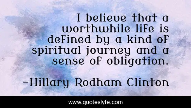 This page presents the quote "I believe that a worthwhile life is defined by a kind of spiritual journey and a sense of obligation.". Author of this quote is Hillary Rodham Clinton. .