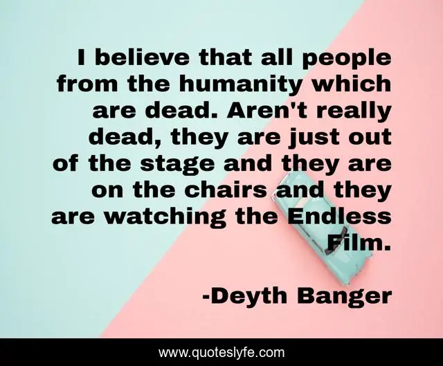 This page presents the quote "I believe that all people from the humanity which are dead. Aren't really dead, they are just out of the stage and they are on the chairs and they are watching the Endless Film.". Author of this quote is Deyth Banger. This quote is about life, people, die, humanity, film, endless,.