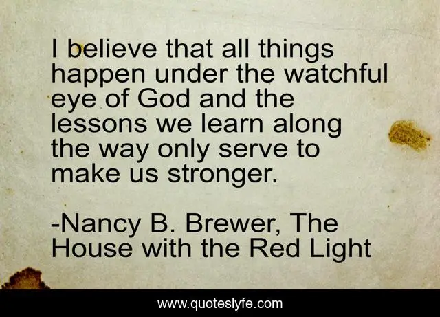 This page presents the quote "I believe that all things happen under the watchful eye of God and the lessons we learn along the way only serve to make us stronger.". Author of this quote is Nancy B. Brewer, The House with the Red Light. This quote is about fiction, christian-fiction, teen-fiction, romance-novels,.