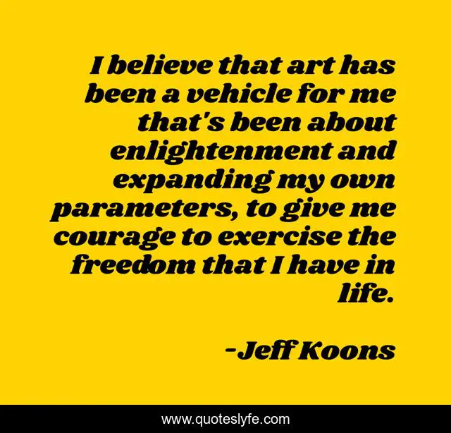 This page presents the quote "I believe that art has been a vehicle for me that's been about enlightenment and expanding my own parameters, to give me courage to exercise the freedom that I have in life.". Author of this quote is Jeff Koons. This quote is about freedom, life, art,.
