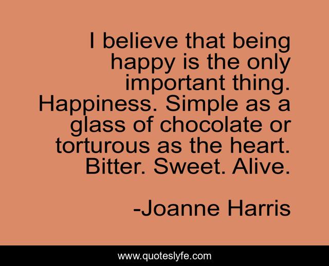 This page presents the quote "I believe that being happy is the only important thing. Happiness. Simple as a glass of chocolate or torturous as the heart. Bitter. Sweet. Alive.". Author of this quote is Joanne Harris. This quote is about joanne-harris, chocolat, happiness,.