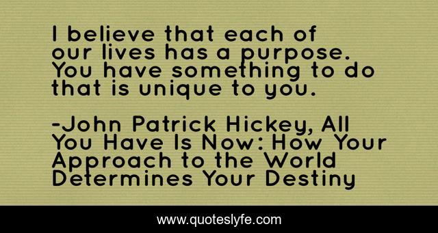 This page presents the quote "I believe that each of our lives has a purpose. You have something to do that is unique to you.". Author of this quote is John Patrick Hickey, All You Have Is Now: How Your Approach to the World Determines Your Destiny. This quote is about success, personal-growth, action, achievement, personal-development, goal-setting, goals,.