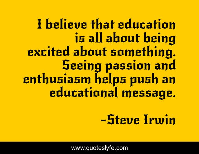 This page presents the quote "I believe that education is all about being excited about something. Seeing passion and enthusiasm helps push an educational message.". Author of this quote is Steve Irwin. This quote is about i believe, believe, passion,.
