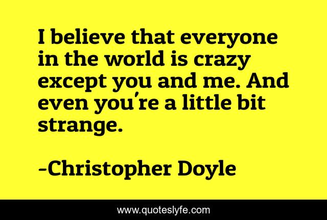 This page presents the quote "I believe that everyone in the world is crazy except you and me. And even you're a little bit strange.". Author of this quote is Christopher Doyle. This quote is about christopher-doyle, crazy,.