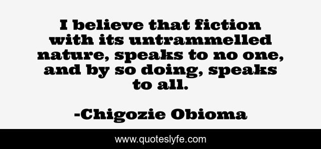 This page presents the quote "I believe that fiction with its untrammelled nature, speaks to no one, and by so doing, speaks to all.". Author of this quote is Chigozie Obioma. This quote is about writing-philosophy, writing-process, writing-craft, writing,.