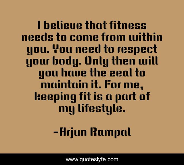 This page presents the quote "I believe that fitness needs to come from within you. You need to respect your body. Only then will you have the zeal to maintain it. For me, keeping fit is a part of my lifestyle.". Author of this quote is Arjun Rampal. This quote is about me, believe, fitness,.