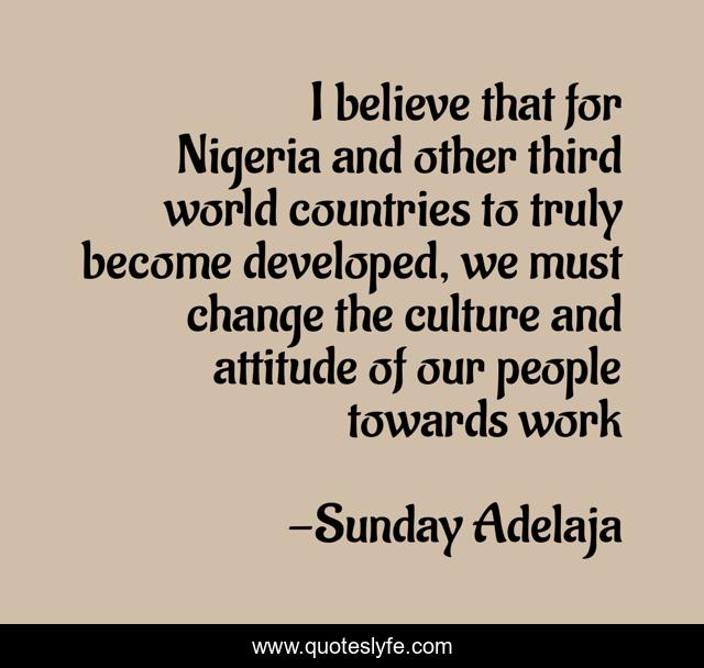 This page presents the quote "I believe that for Nigeria and other third world countries to truly become developed, we must change the culture and attitude of our people towards work". Author of this quote is Sunday Adelaja. This quote is about people, developed, countries, truly, behaviour, culture, attitude, become, world,.