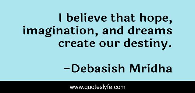 This page presents the quote "I believe that hope, imagination, and dreams create our destiny.". Author of this quote is Debasish Mridha. This quote is about life, love, knowledge, inspirational, intelligence, philosophy, wisdom, affection, truth,.