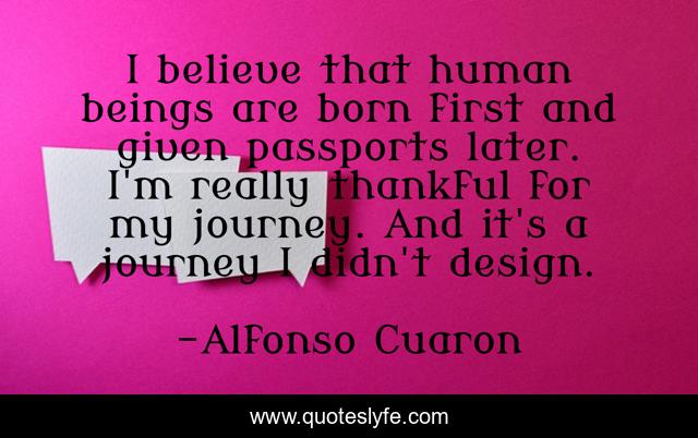 This page presents the quote "I believe that human beings are born first and given passports later. I'm really thankful for my journey. And it's a journey I didn't design.". Author of this quote is Alfonso Cuaron. This quote is about believe, design, journey,.
