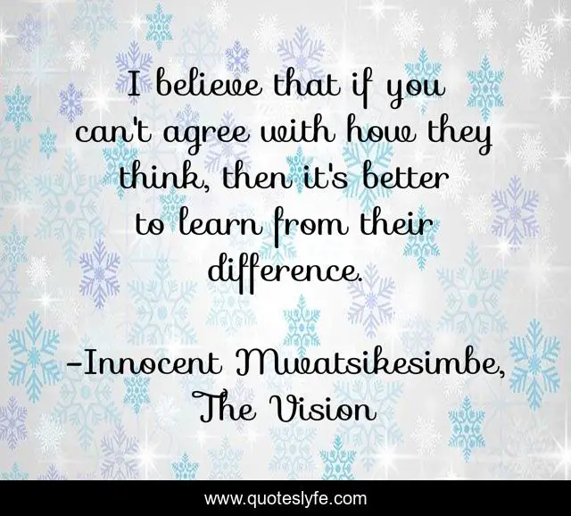This page presents the quote "I believe that if you can't agree with how they think, then it's better to learn from their difference.". Author of this quote is Innocent Mwatsikesimbe, The Vision. This quote is about individuality, inspirational, open-mindedness, self-improvement, learning, enthusiasm, beliefs,.