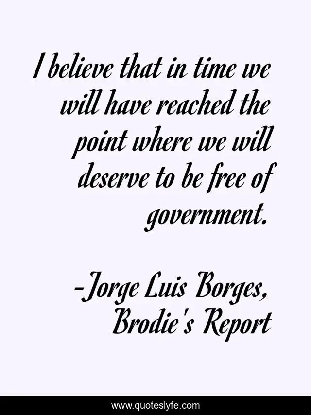 This page presents the quote "I believe that in time we will have reached the point where we will deserve to be free of government.". Author of this quote is Jorge Luis Borges, Brodie's Report. This quote is about anarchism, government,.