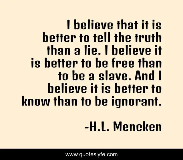 This page presents the quote "I believe that it is better to tell the truth than a lie. I believe it is better to be free than to be a slave. And I believe it is better to know than to be ignorant.". Author of this quote is H.L. Mencken. This quote is about human-nature, life, truth,.