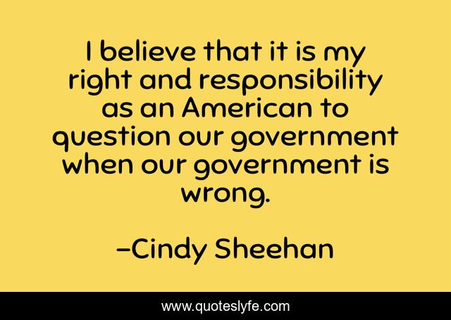 This page presents the quote "I believe that it is my right and responsibility as an American to question our government when our government is wrong.". Author of this quote is Cindy Sheehan. This quote is about american, responsibility,.