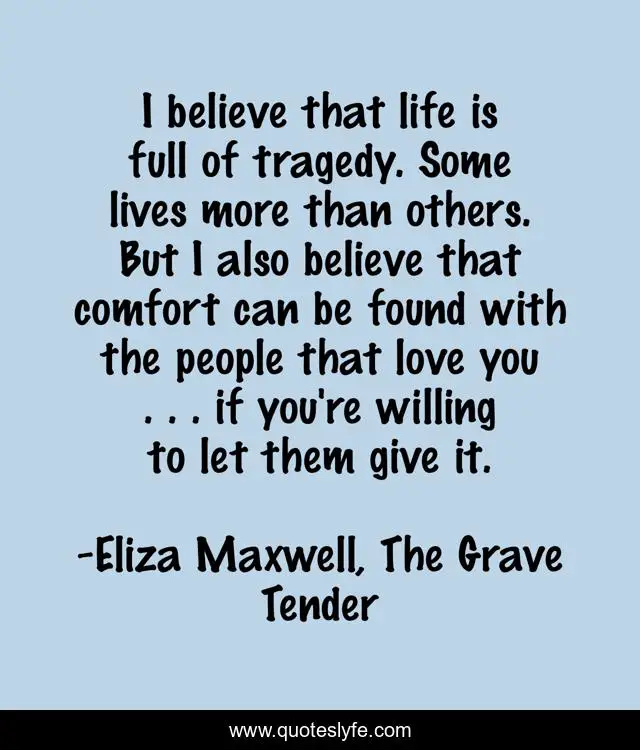 This page presents the quote "I believe that life is full of tragedy. Some lives more than others. But I also believe that comfort can be found with the people that love you . . . if you're willing to let them give it.". Author of this quote is Eliza Maxwell, The Grave Tender. This quote is about comfort, love, tragedy, affection, hope,.