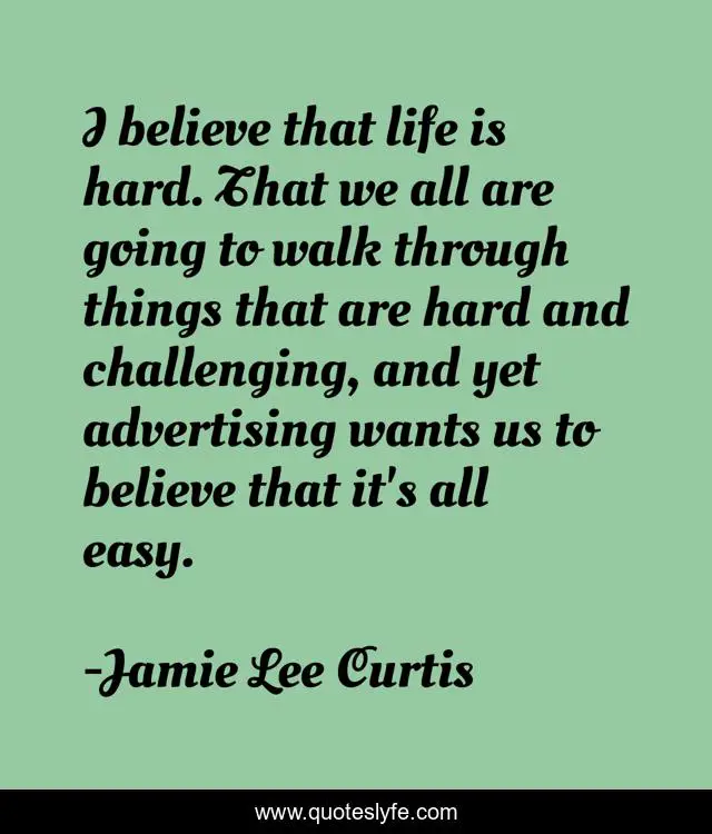 This page presents the quote "I believe that life is hard. That we all are going to walk through things that are hard and challenging, and yet advertising wants us to believe that it's all easy.". Author of this quote is Jamie Lee Curtis. This quote is about believe, advertising, walk,.