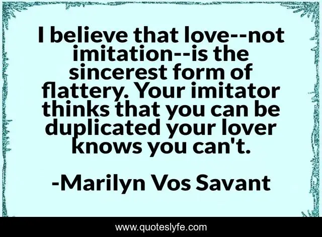 This page presents the quote "I believe that love--not imitation--is the sincerest form of flattery. Your imitator thinks that you can be duplicated your lover knows you can't.". Author of this quote is Marilyn Vos Savant. This quote is about flattery, love, affection, self-esteem,.