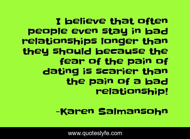 This page presents the quote "I believe that often people even stay in bad relationships longer than they should because the fear of the pain of dating is scarier than the pain of a bad relationship!". Author of this quote is Karen Salmansohn. This quote is about fear, pain, relationship,.