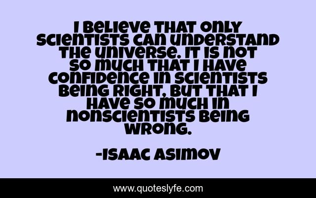 This page presents the quote "I believe that only scientists can understand the universe. It is not so much that I have confidence in scientists being right, but that I have so much in nonscientists being wrong.". Author of this quote is Isaac Asimov. This quote is about confidence, right, belief, science, scientists, understanding, wrong, universe,.
