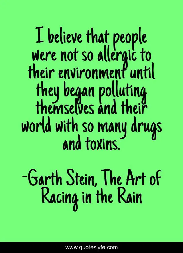 This page presents the quote "I believe that people were not so allergic to their environment until they began polluting themselves and their world with so many drugs and toxins.". Author of this quote is Garth Stein, The Art of Racing in the Rain. .
