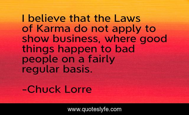 This page presents the quote "I believe that the Laws of Karma do not apply to show business, where good things happen to bad people on a fairly regular basis.". Author of this quote is Chuck Lorre. This quote is about good, believe, karma,.