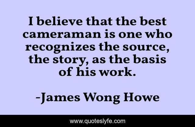 This page presents the quote "I believe that the best cameraman is one who recognizes the source, the story, as the basis of his work.". Author of this quote is James Wong Howe. This quote is about i believe, believe, best,.