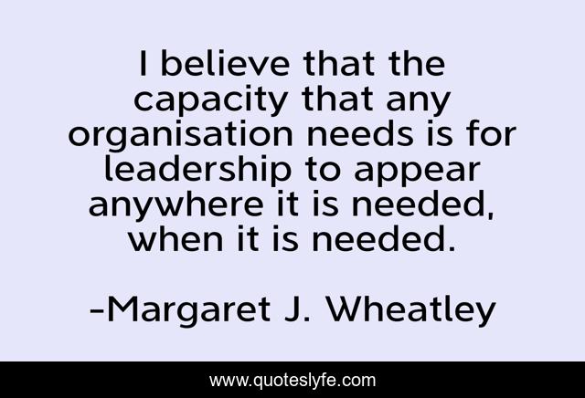This page presents the quote "I believe that the capacity that any organisation needs is for leadership to appear anywhere it is needed, when it is needed.". Author of this quote is Margaret J. Wheatley. This quote is about i believe, believe, capacity,.