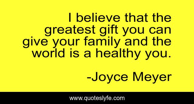 This page presents the quote "I believe that the greatest gift you can give your family and the world is a healthy you.". Author of this quote is Joyce Meyer. This quote is about world, believe, health,.