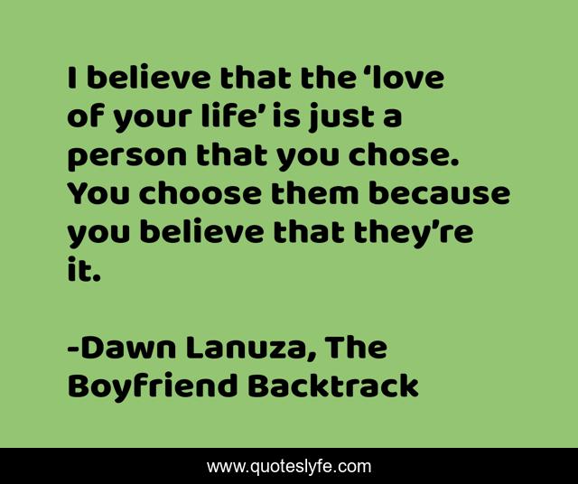 This page presents the quote "I believe that the ‘love of your life’ is just a person that you chose. You choose them because you believe that they’re it.". Author of this quote is Dawn Lanuza, The Boyfriend Backtrack. This quote is about relationships, love, affection, choice,.