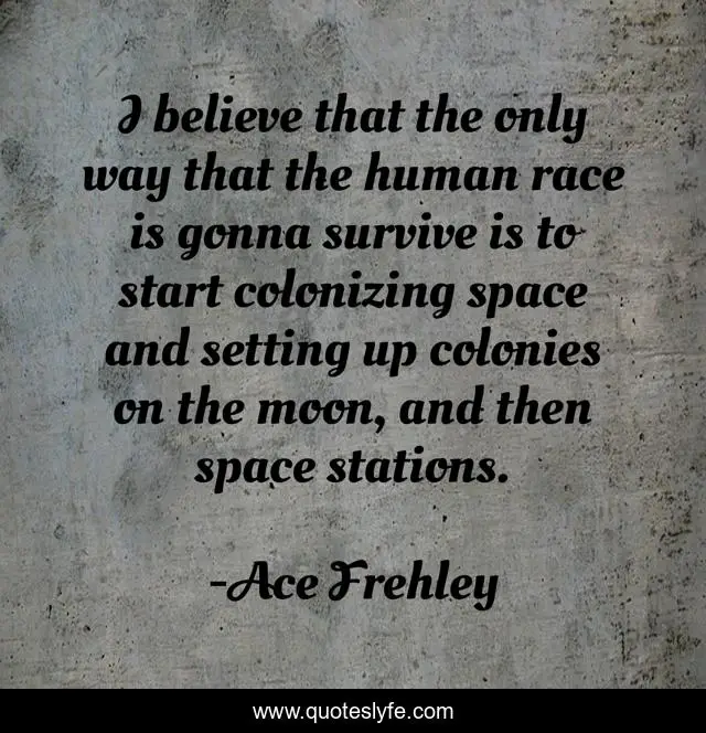 This page presents the quote "I believe that the only way that the human race is gonna survive is to start colonizing space and setting up colonies on the moon, and then space stations.". Author of this quote is Ace Frehley. This quote is about life, space, survival, environment, environmentalism, earth, ace-frehley,.