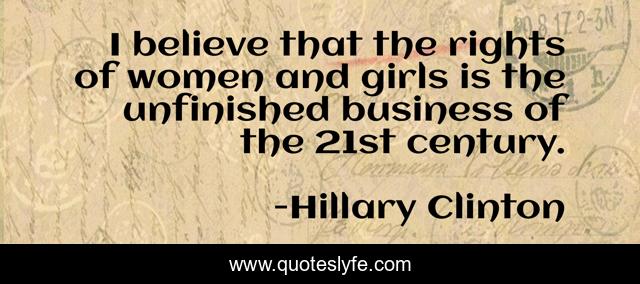 This page presents the quote "I believe that the rights of women and girls is the unfinished business of the 21st century.". Author of this quote is Hillary Clinton. This quote is about i believe, believe, women,.