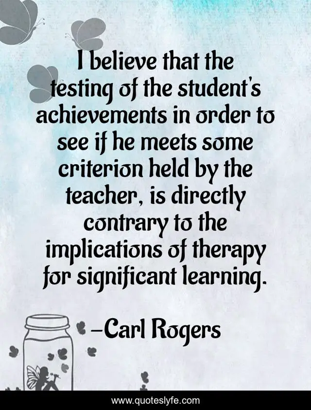 This page presents the quote "I believe that the testing of the student's achievements in order to see if he meets some criterion held by the teacher, is directly contrary to the implications of therapy for significant learning.". Author of this quote is Carl Rogers. This quote is about i believe, believe, learning,.