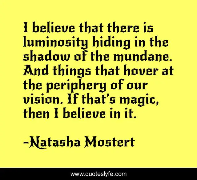 This page presents the quote "I believe that there is luminosity hiding in the shadow of the mundane. And things that hover at the periphery of our vision. If that’s magic, then I believe in it.". Author of this quote is Natasha Mostert. .