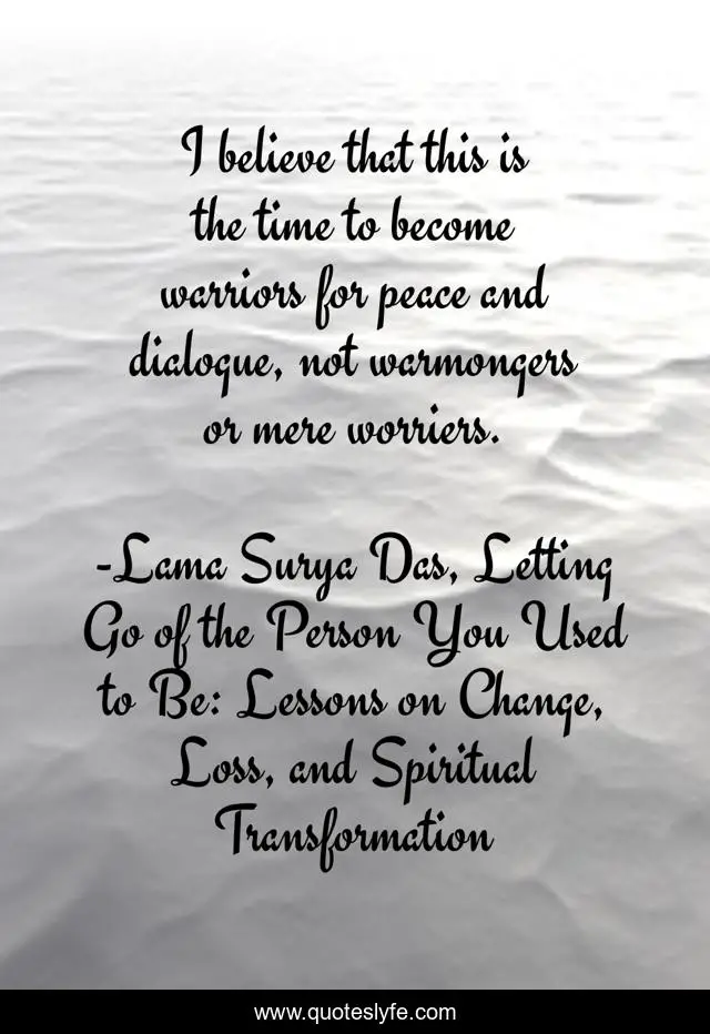 This page presents the quote "I believe that this is the time to become warriors for peace and dialogue, not warmongers or mere worriers.". Author of this quote is Lama Surya Das, Letting Go of the Person You Used to Be: Lessons on Change, Loss, and Spiritual Transformation. This quote is about peace, inspiration, profound, wisdom,.