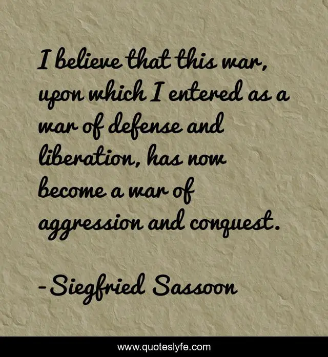 This page presents the quote "I believe that this war, upon which I entered as a war of defense and liberation, has now become a war of aggression and conquest.". Author of this quote is Siegfried Sassoon. .