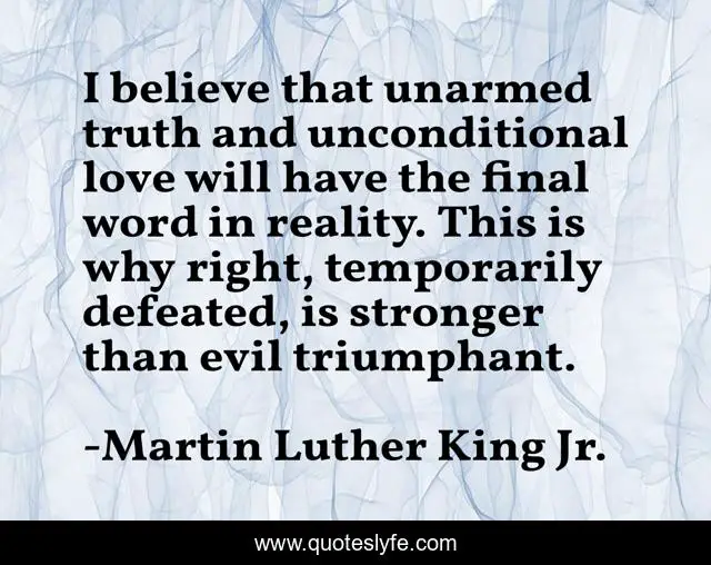 This page presents the quote "I believe that unarmed truth and unconditional love will have the final word in reality. This is why right, temporarily defeated, is stronger than evil triumphant.". Author of this quote is Martin Luther King Jr.. This quote is about good-and-evil, love, truth, affection,.
