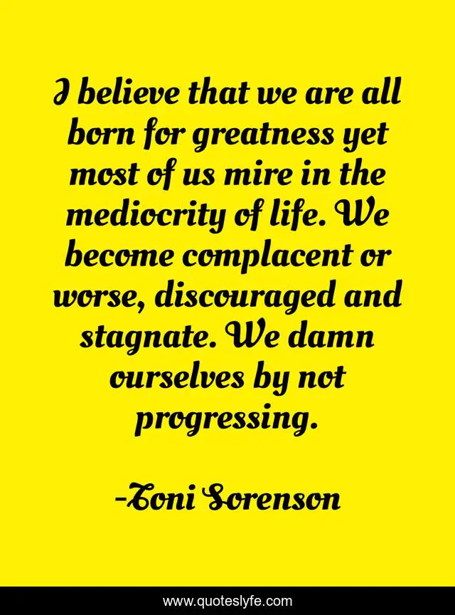 This page presents the quote "I believe that we are all born for greatness yet most of us mire in the mediocrity of life. We become complacent or worse, discouraged and stagnate. We damn ourselves by not progressing.". Author of this quote is Toni Sorenson. This quote is about progress, life, achievement, greatness,.