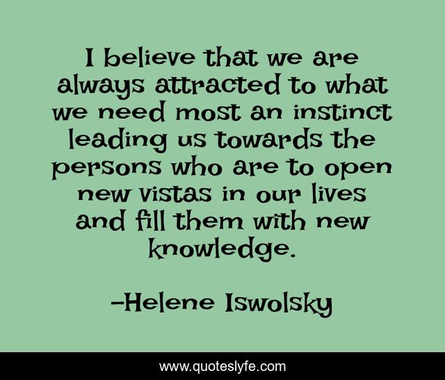 This page presents the quote "I believe that we are always attracted to what we need most an instinct leading us towards the persons who are to open new vistas in our lives and fill them with new knowledge.". Author of this quote is Helene Iswolsky. This quote is about friends, family,.