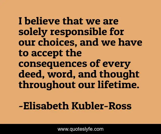 This page presents the quote "I believe that we are solely responsible for our choices, and we have to accept the consequences of every deed, word, and thought throughout our lifetime.". Author of this quote is Elisabeth Kubler-Ross. This quote is about thought, believe, choices,.