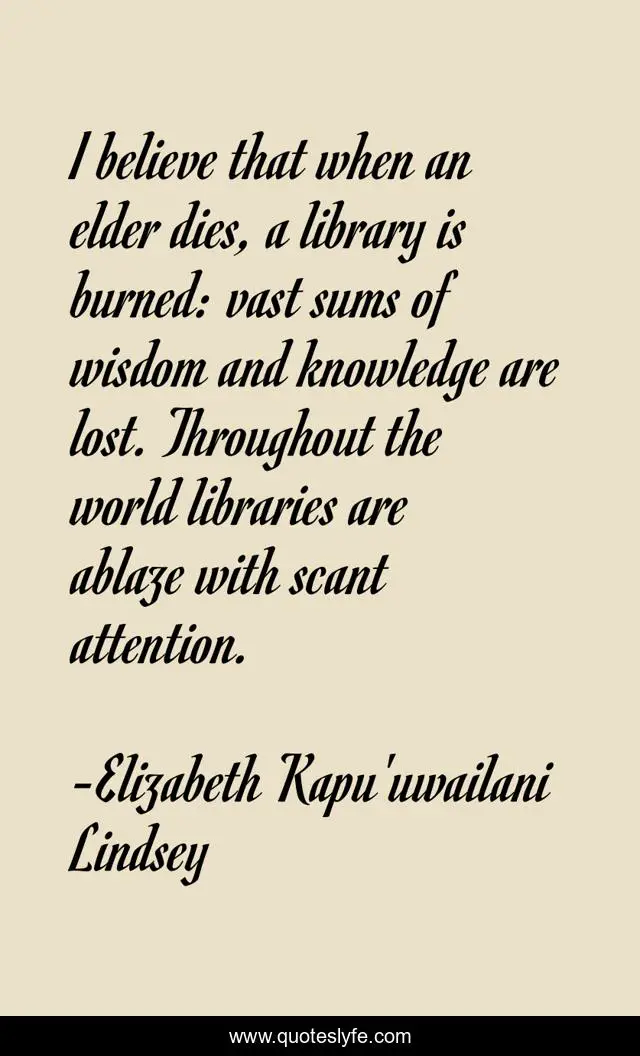 This page presents the quote "I believe that when an elder dies, a library is burned: vast sums of wisdom and knowledge are lost. Throughout the world libraries are ablaze with scant attention.". Author of this quote is Elizabeth Kapu'uwailani Lindsey. This quote is about world, believe, wisdom,.