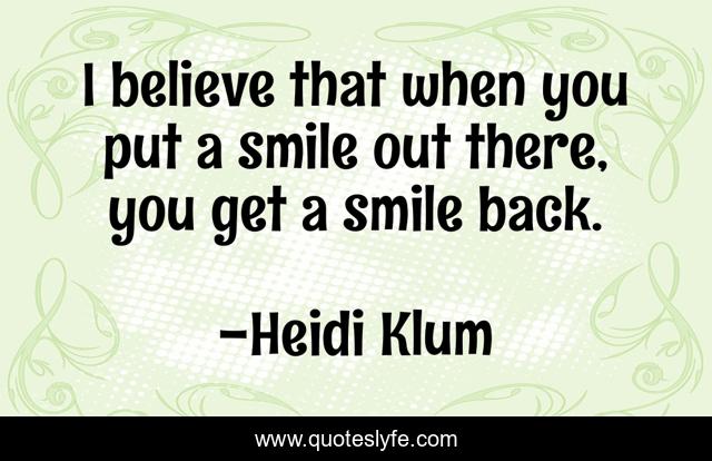 This page presents the quote "I believe that when you put a smile out there, you get a smile back.". Author of this quote is Heidi Klum. This quote is about i believe, believe,.