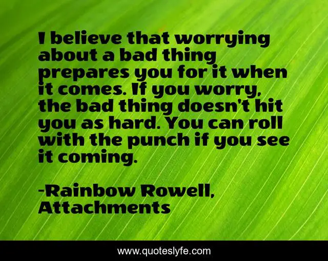 This page presents the quote "I believe that worrying about a bad thing prepares you for it when it comes. If you worry, the bad thing doesn't hit you as hard. You can roll with the punch if you see it coming.". Author of this quote is Rainbow Rowell, Attachments. .