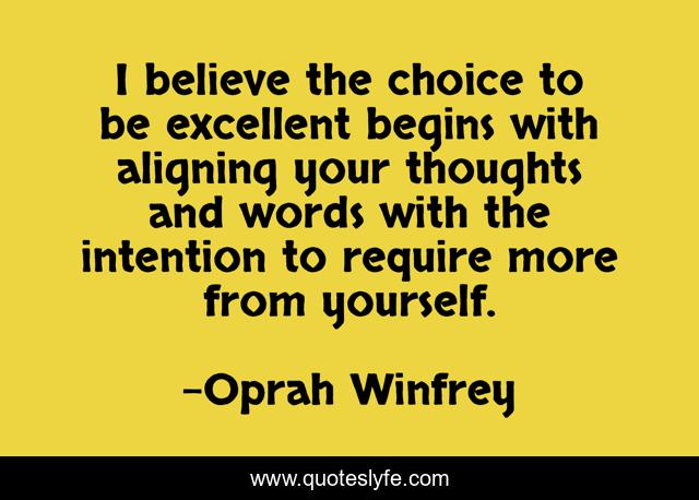 This page presents the quote "I believe the choice to be excellent begins with aligning your thoughts and words with the intention to require more from yourself.". Author of this quote is Oprah Winfrey. .