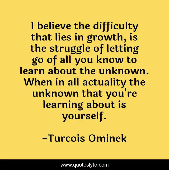 This page presents the quote "I believe the difficulty that lies in growth, is the struggle of letting go of all you know to learn about the unknown. When in all actuality the unknown that you're learning about is yourself.". Author of this quote is Turcois Ominek. This quote is about life, belief, growth-process, unknown, inspirational, learning-process, learning, growth, struggle,.