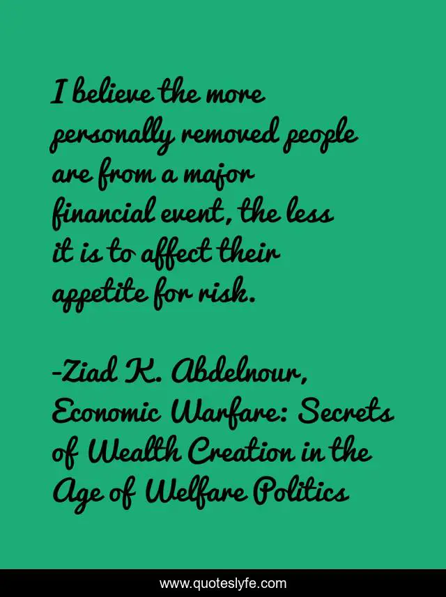This page presents the quote "I believe the more personally removed people are from a major financial event, the less it is to affect their appetite for risk.". Author of this quote is Ziad K. Abdelnour, Economic Warfare: Secrets of Wealth Creation in the Age of Welfare Politics. This quote is about financial, risk,.