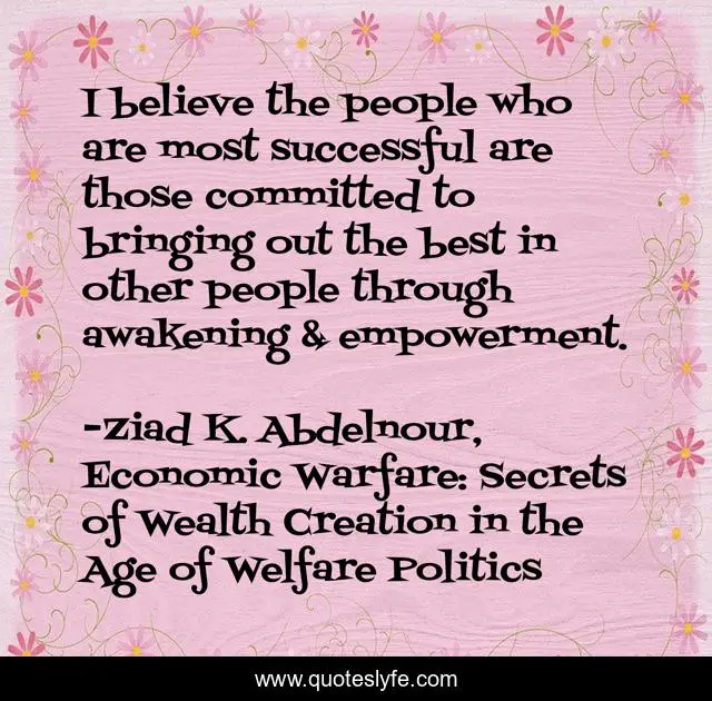 This page presents the quote "I believe the people who are most successful are those committed to bringing out the best in other people through awakening & empowerment.". Author of this quote is Ziad K. Abdelnour, Economic Warfare: Secrets of Wealth Creation in the Age of Welfare Politics. This quote is about successful, awakening, empowerment,.