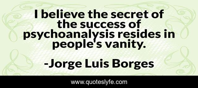 This page presents the quote "I believe the secret of the success of psychoanalysis resides in people's vanity.". Author of this quote is Jorge Luis Borges. This quote is about psychoanalysis, vanity,.