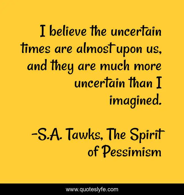 "S.A. Tawks, The Spirit of Pessimism Quotes." Quoteslyfe.com, 2025. Sat. 06 Dec. 2025. <https://www.quoteslyfe.com/quote/I-believe-the-uncertain-times-are-almost-126077>.