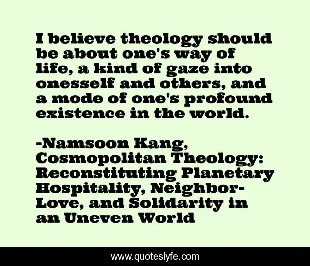 This page presents the quote "I believe theology should be about one's way of life, a kind of gaze into onesself and others, and a mode of one's profound existence in the world.". Author of this quote is Namsoon Kang, Cosmopolitan Theology: Reconstituting Planetary Hospitality, Neighbor-Love, and Solidarity in an Uneven World. This quote is about religion, cosmopolitanism, christianity, cosmopolitan, theology,.
