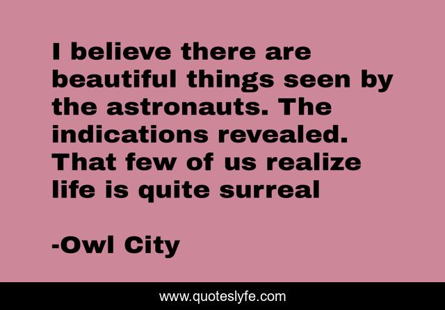 This page presents the quote "I believe there are beautiful things seen by the astronauts. The indications revealed. That few of us realize life is quite surreal". Author of this quote is Owl City. This quote is about beautiful, life, astronauts,.