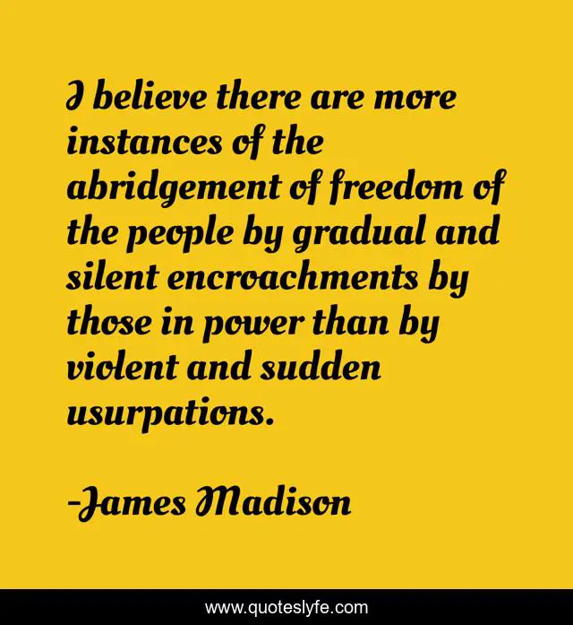 This page presents the quote "I believe there are more instances of the abridgement of freedom of the people by gradual and silent encroachments by those in power than by violent and sudden usurpations.". Author of this quote is James Madison. This quote is about freedom, believe, people,.